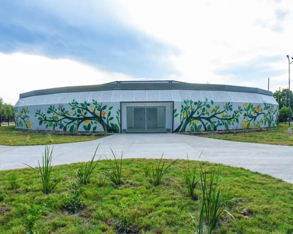 Su proyecto se concretó sobre una superficie de aproximadamente 1 hectárea, conformando una cubierta total de 1800 metros cuadrados. El diseño exterior del edificio representa el símbolo del infinito.