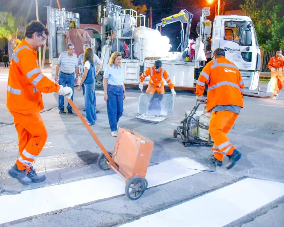 La intendente, Ing. Norma Fuentes,en la noche del lunes supervisó los trabajos de demarcación de sendas peatonales y líneas de frenado, que comprenden más de 200 esquinas de la ciudad.